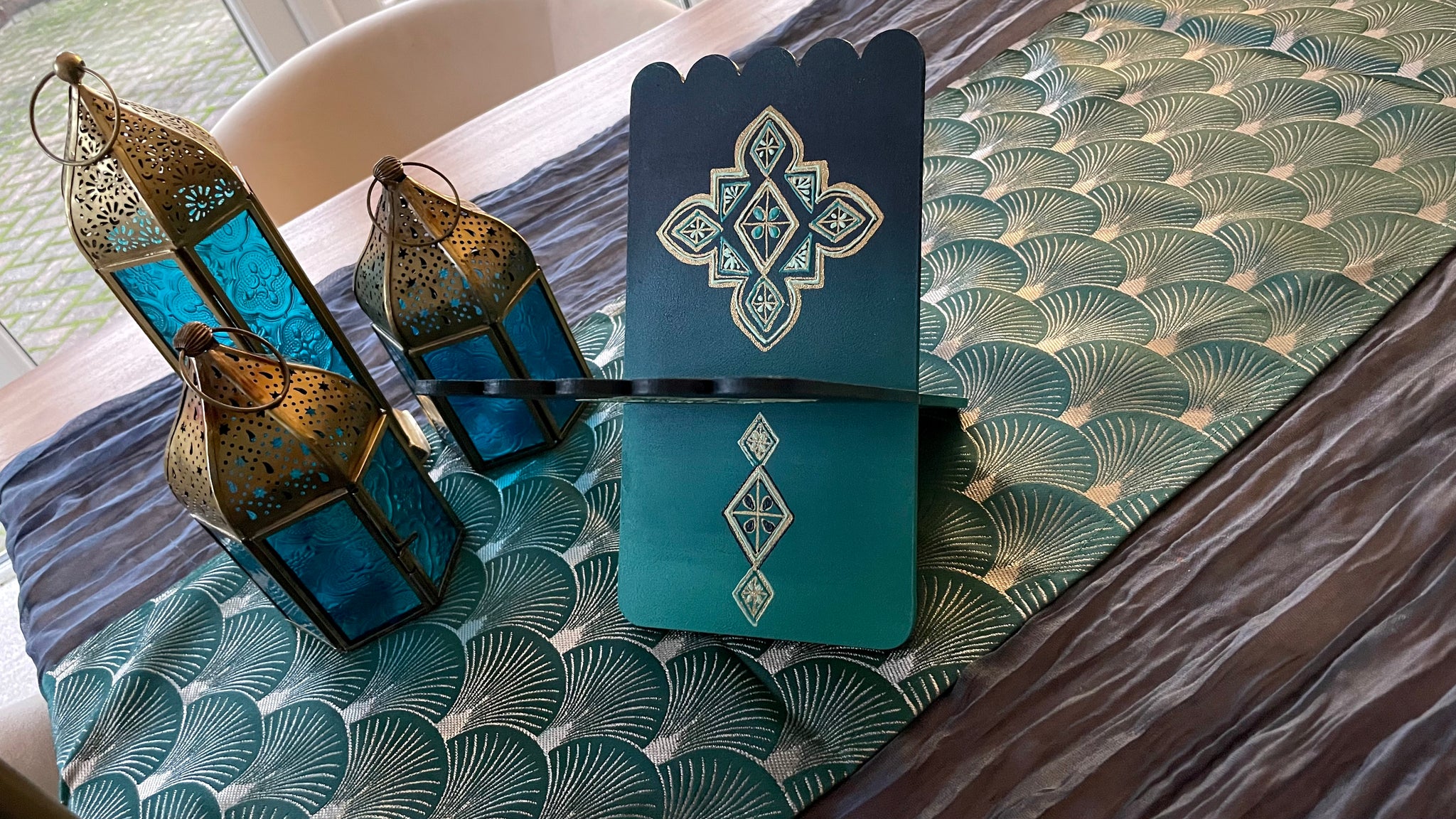 Beautifully painted kitaab/book stand used traditionally when studying Qur'an. The incredible rayhaal is made up of two hand painted pieces that slot together. Use it in a decorative way as a display piece or, do it justice by placing The Holy Book upon it. An incredible heirloom piece.
